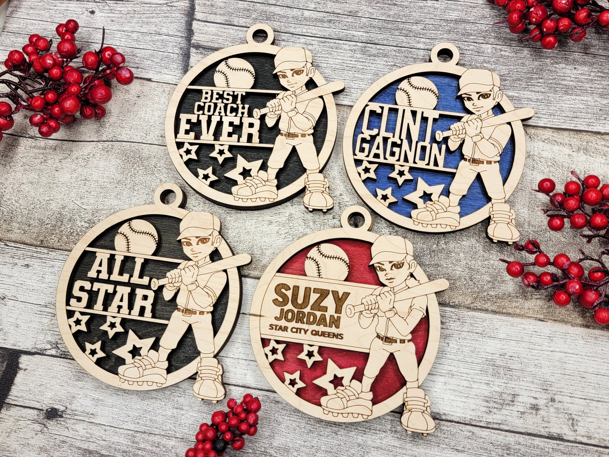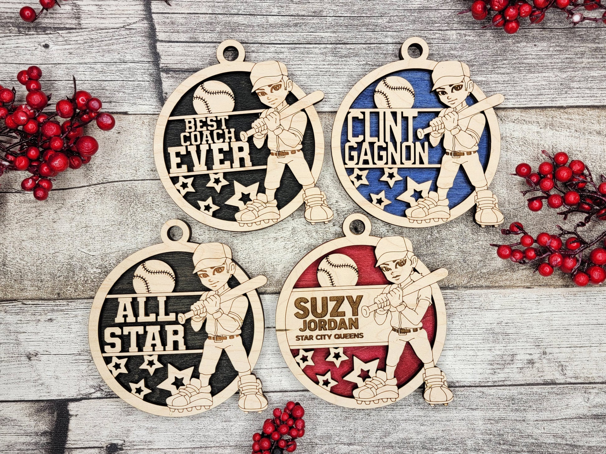 An animated personalized baseball ornament laser-cut from wood, crafted specifically as a Christmas gift, is a unique and festive tribute to the beloved sport. This carefully designed ornament seamlessly combines the excitement of baseball with the holiday spirit, making it an ideal gift for sports enthusiasts.