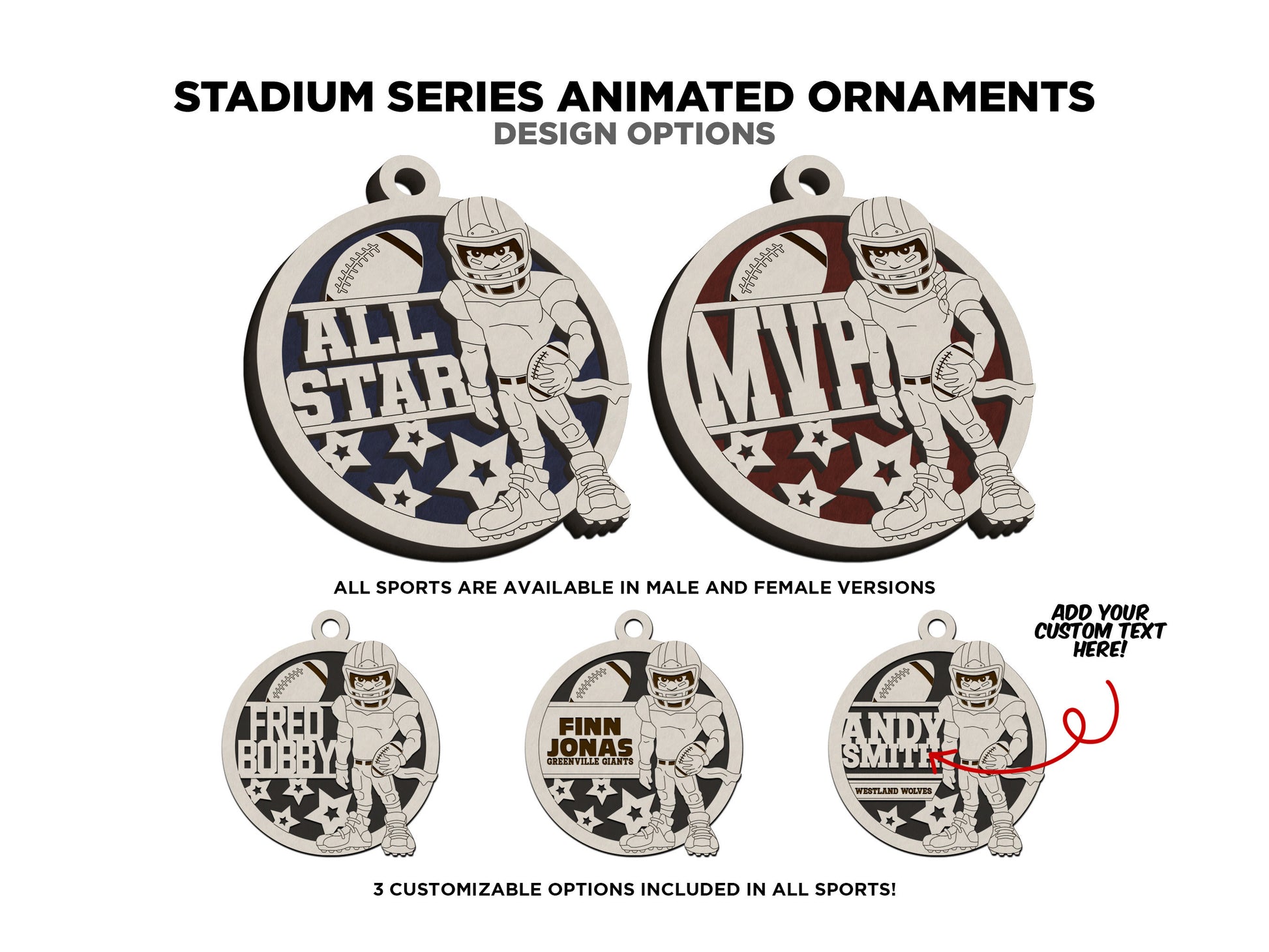 An animated personalized football ornament laser-cut from wood is a charming and unique decorative piece that combines craftsmanship and technology. This ornament is crafted with precision using a laser-cutting machine, allowing for intricate details and customization.