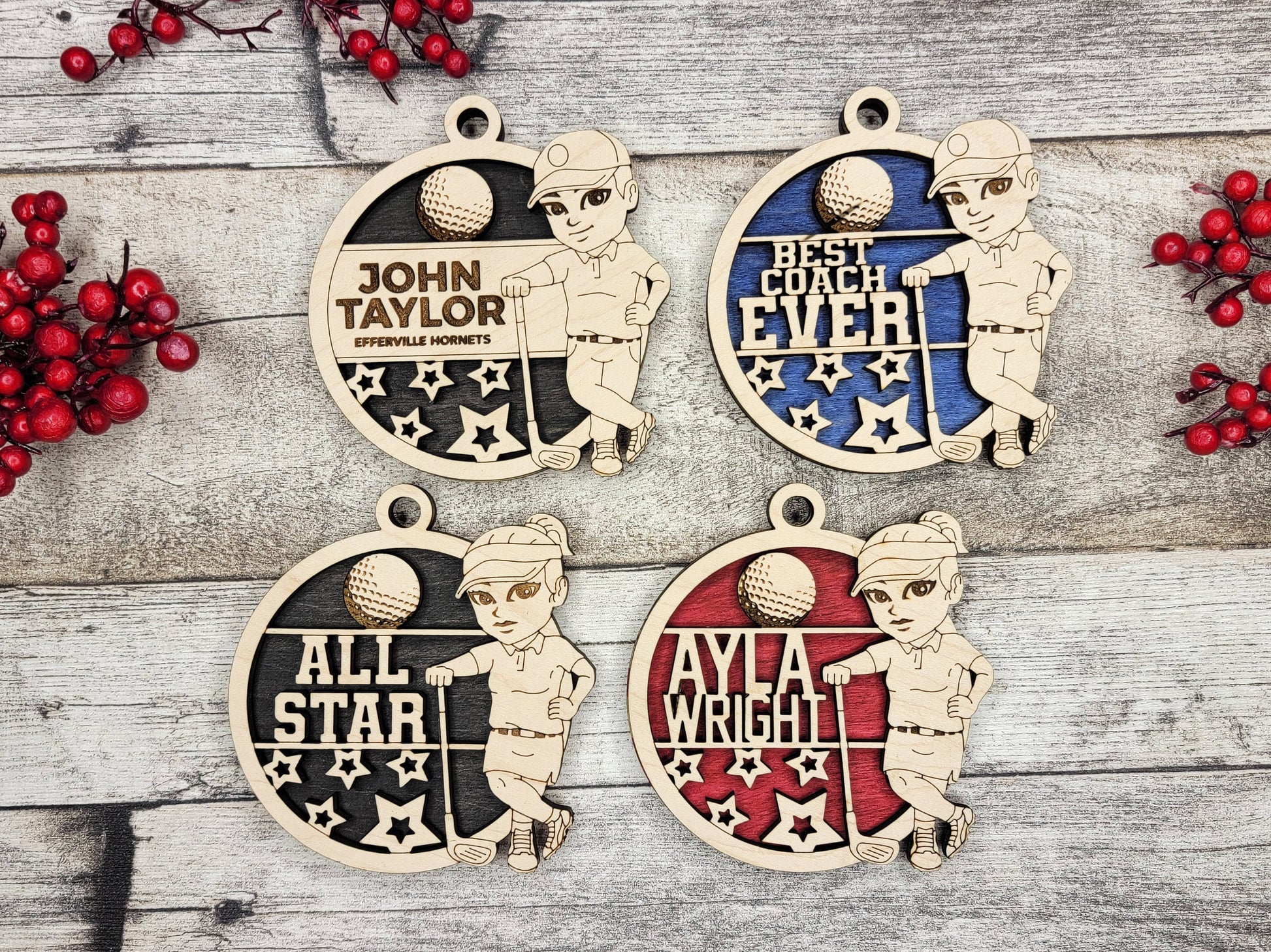 Taking inspiration from golf, the ornament features precise laser-cut details that capture the essential elements of the sport. The design may include golf clubs, balls, or even a golfer in mid-swing. The wood's natural grain may be incorporated to add texture and authenticity to the overall composition. To infuse a festive touch, subtle holiday elements like snowflakes or stars could be intertwined with the golf theme.