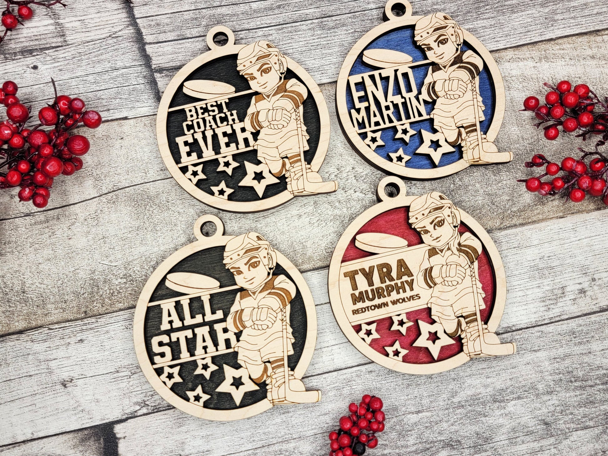 Adding a personal touch, the ornament can be customized with the recipient's name, a significant date, or a favorite team logo. These personalizations are intricately engraved onto the wood, making the ornament a cherished and meaningful Christmas gift for hockey enthusiasts.