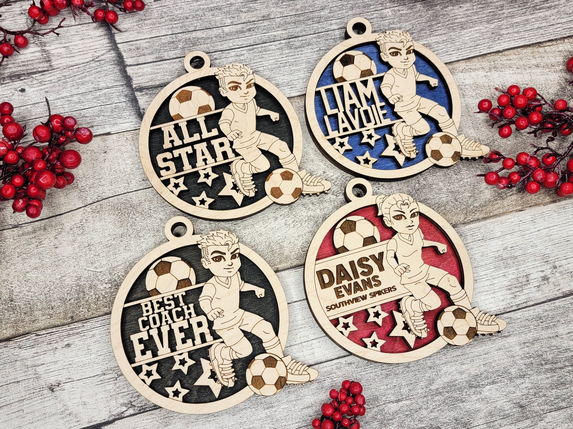 To add a personal touch, the ornament can be customized with the recipient's name, jersey number, or the name of their favorite team. These personalizations are intricately engraved onto the wood, making the ornament a meaningful and cherished Christmas gift for soccer enthusiasts.