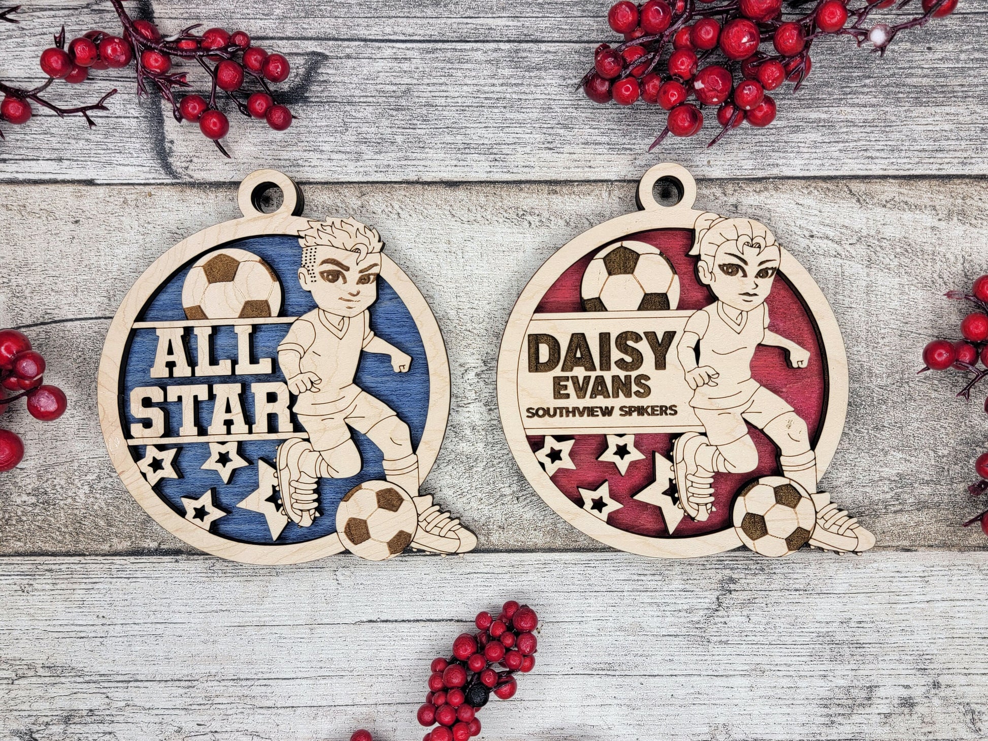 An animated personalized soccer ornament laser-cut from wood, designed as a Christmas gift, is a dynamic and spirited decoration that captures the excitement and passion of the world's most popular sport. Integrating the precision of laser-cut craftsmanship with subtle animation, this ornament makes for a thoughtful and distinctive present. Here's a detailed description: