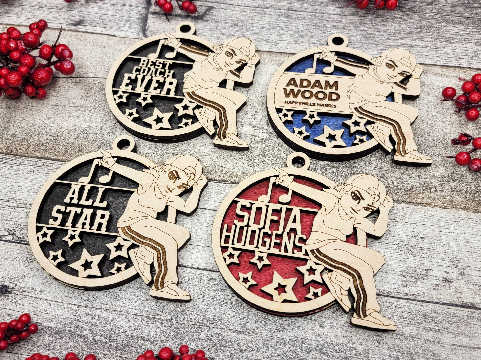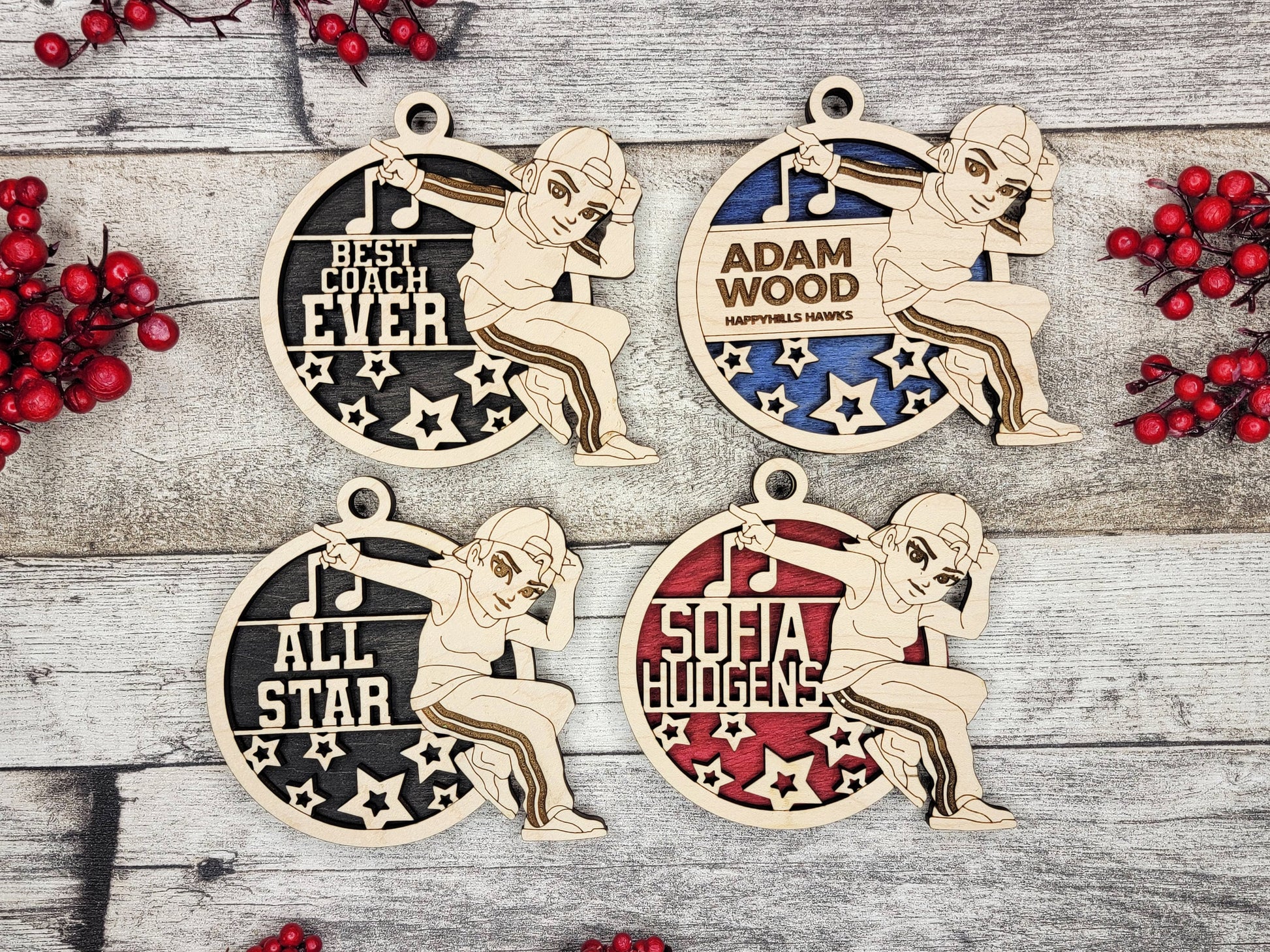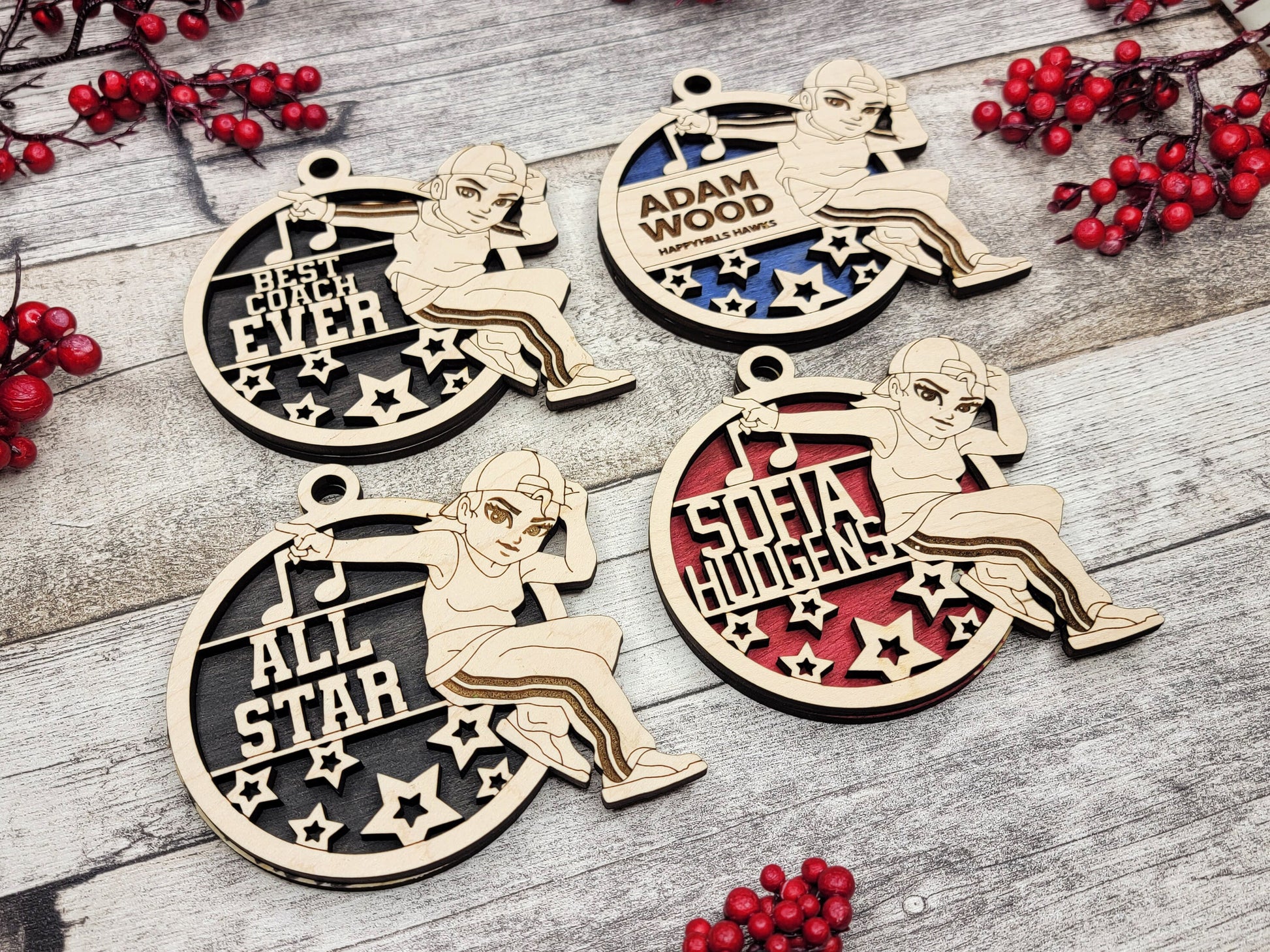 An animated personalized street dance ornament laser-cut from wood, created as a Christmas gift, is a dynamic and lively decoration that captures the spirit and rhythm of street dance. This ornament seamlessly combines the precision of laser-cut craftsmanship with subtle animation, making it a thoughtful and unique present. Here's a detailed description: