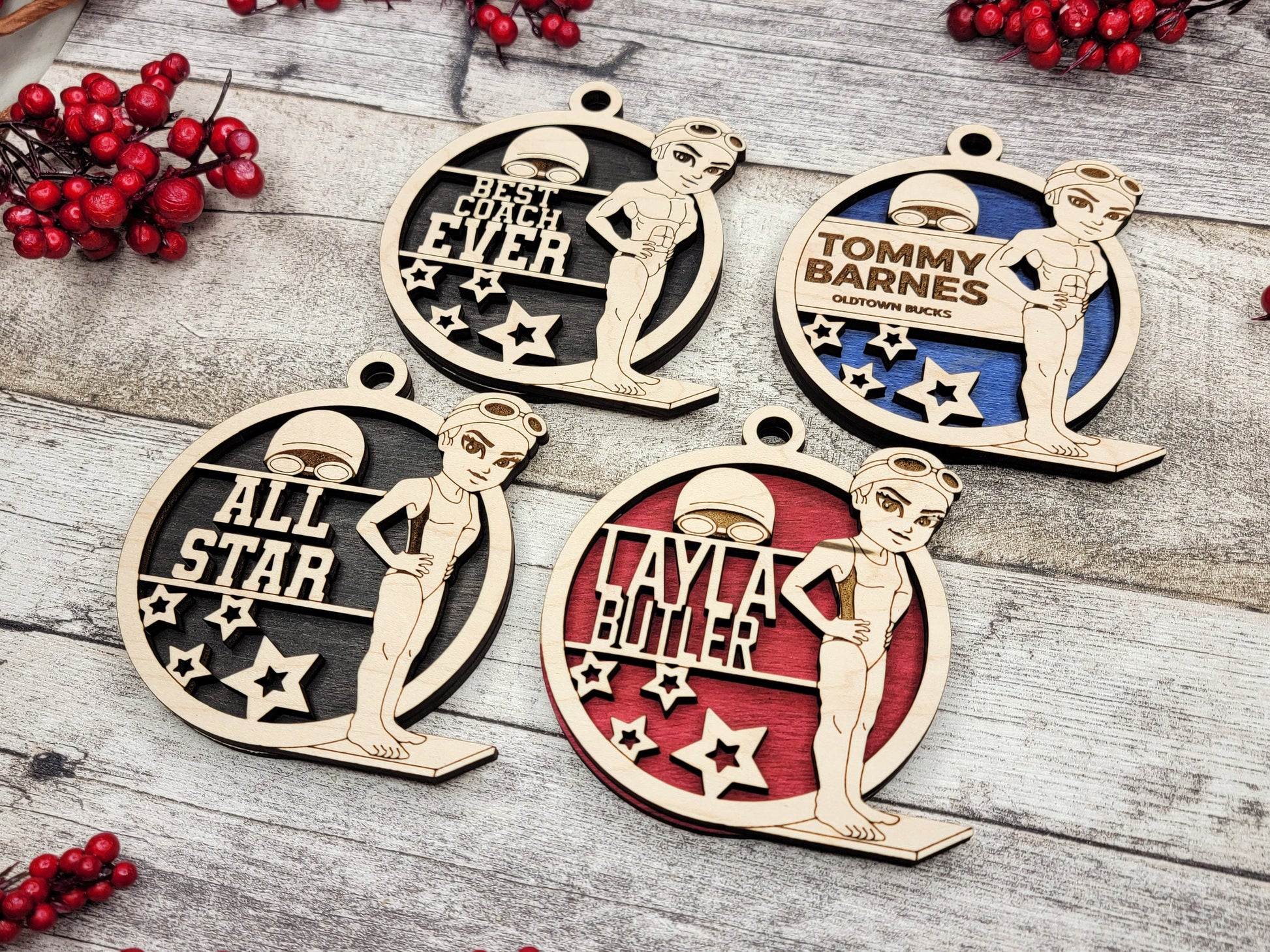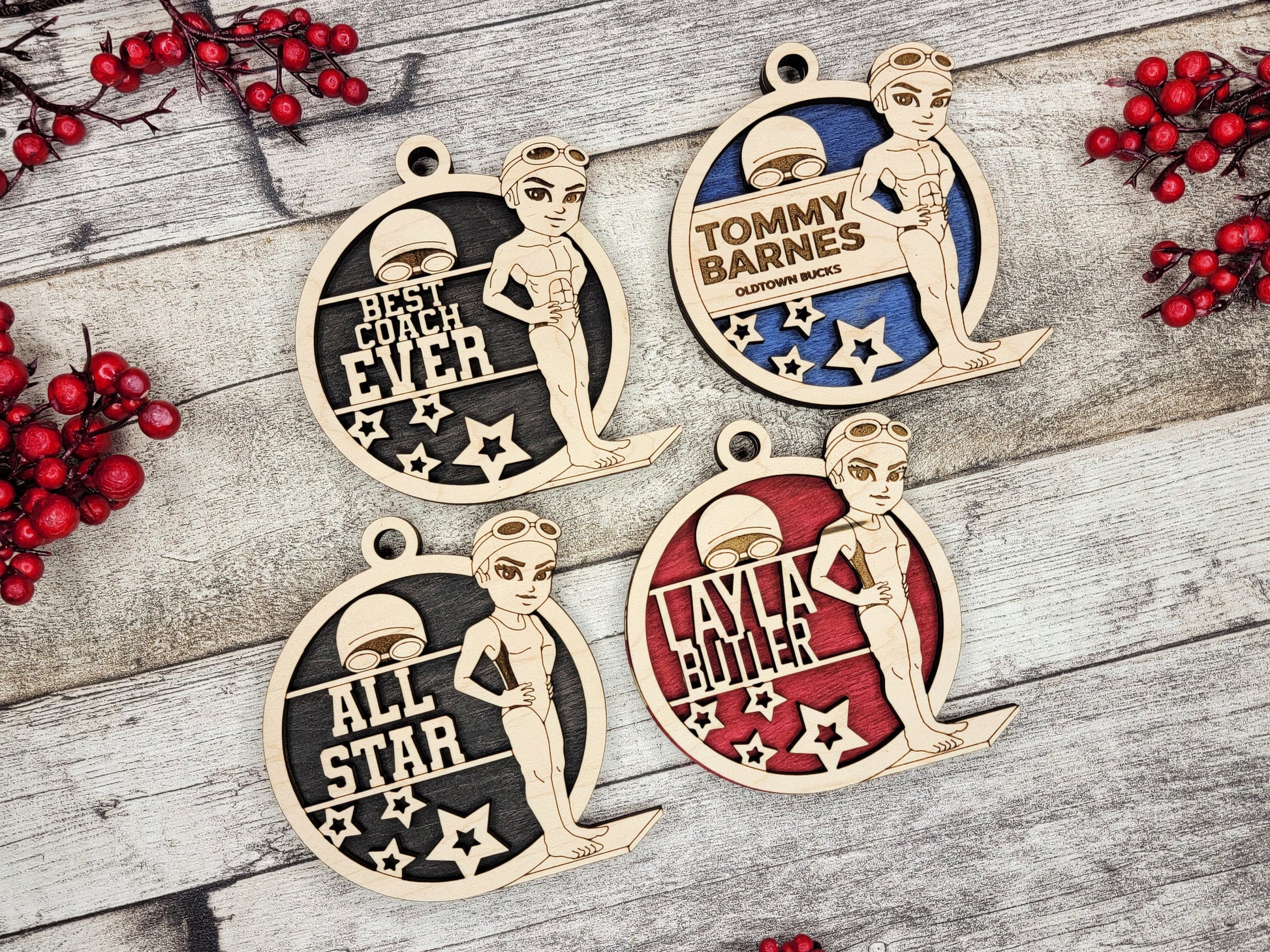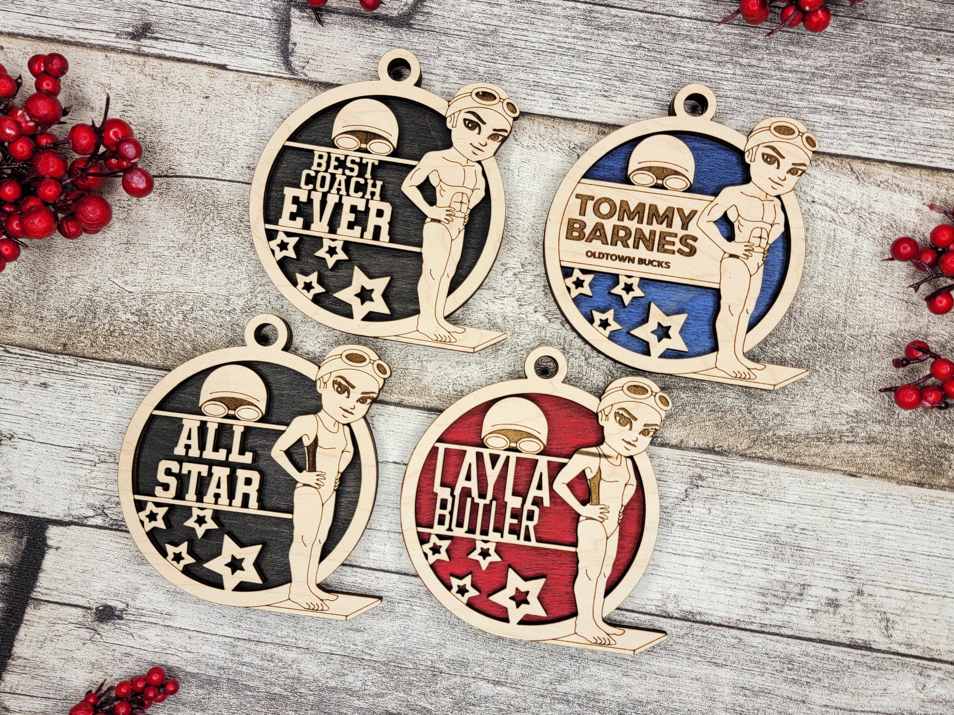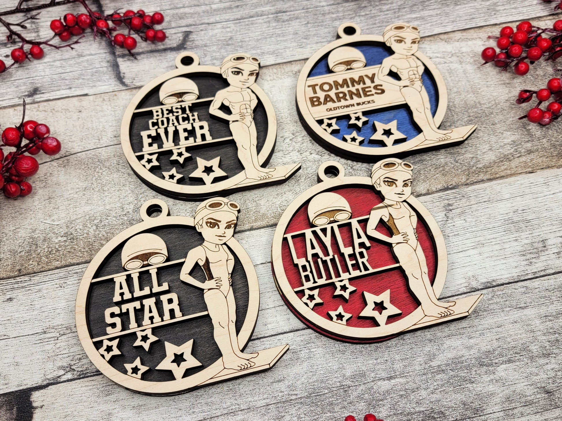 To add a personal touch, the ornament can be customized with the recipient's name, a specific swimming style (such as freestyle or butterfly), or a significant achievement. These personalizations are intricately engraved onto the wood, making the ornament a meaningful and cherished Christmas gift for swimmers.