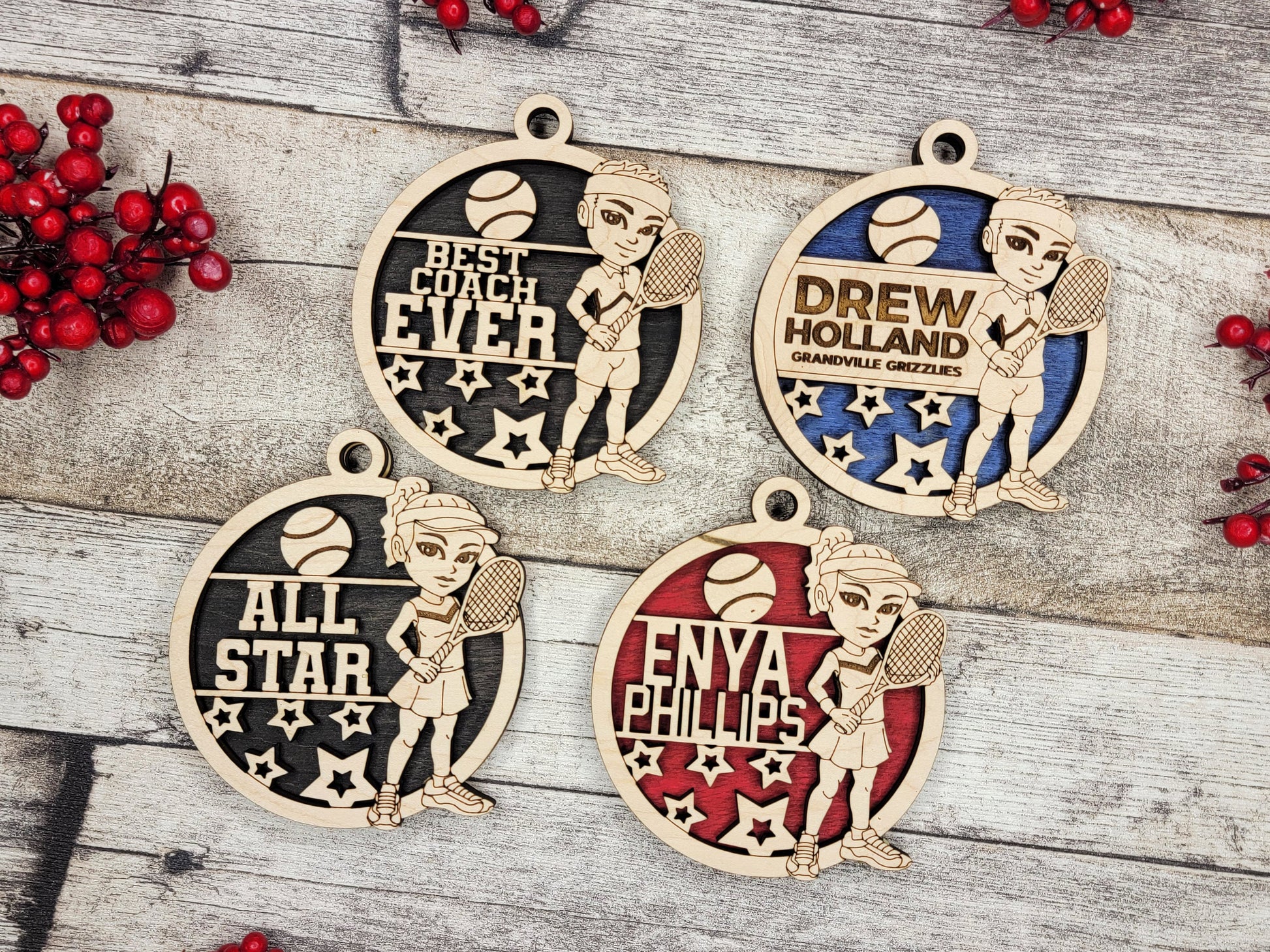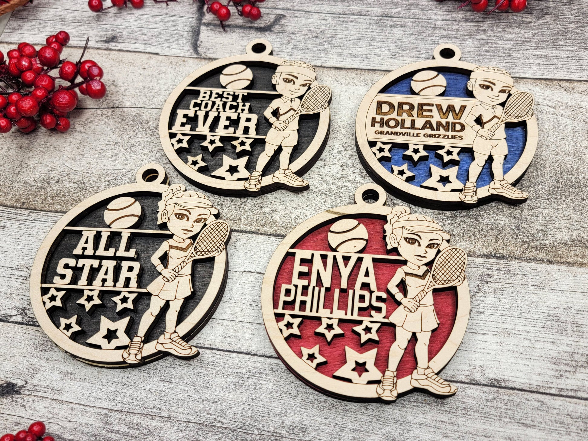 Inspired by tennis, the ornament features precision laser-cut details showcasing iconic elements such as a tennis racket, a tennis ball in motion, or a stylized tennis court. The design captures the dynamic and fast-paced nature of the sport. The wood's natural grain may be incorporated to add texture and authenticity to the overall composition.