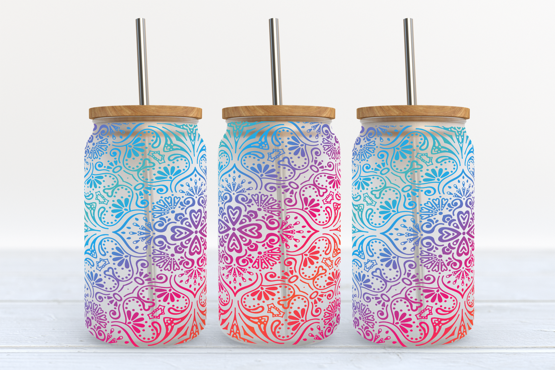 Elevate Your Mandala Experience: Embrace your love for Mandalas while enjoying your cold beverages with the 16oz Glass Can Tumbler, designed to enhance your drink time.