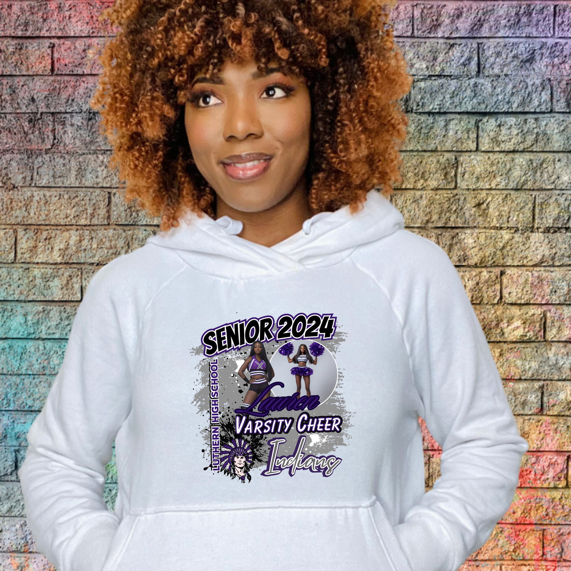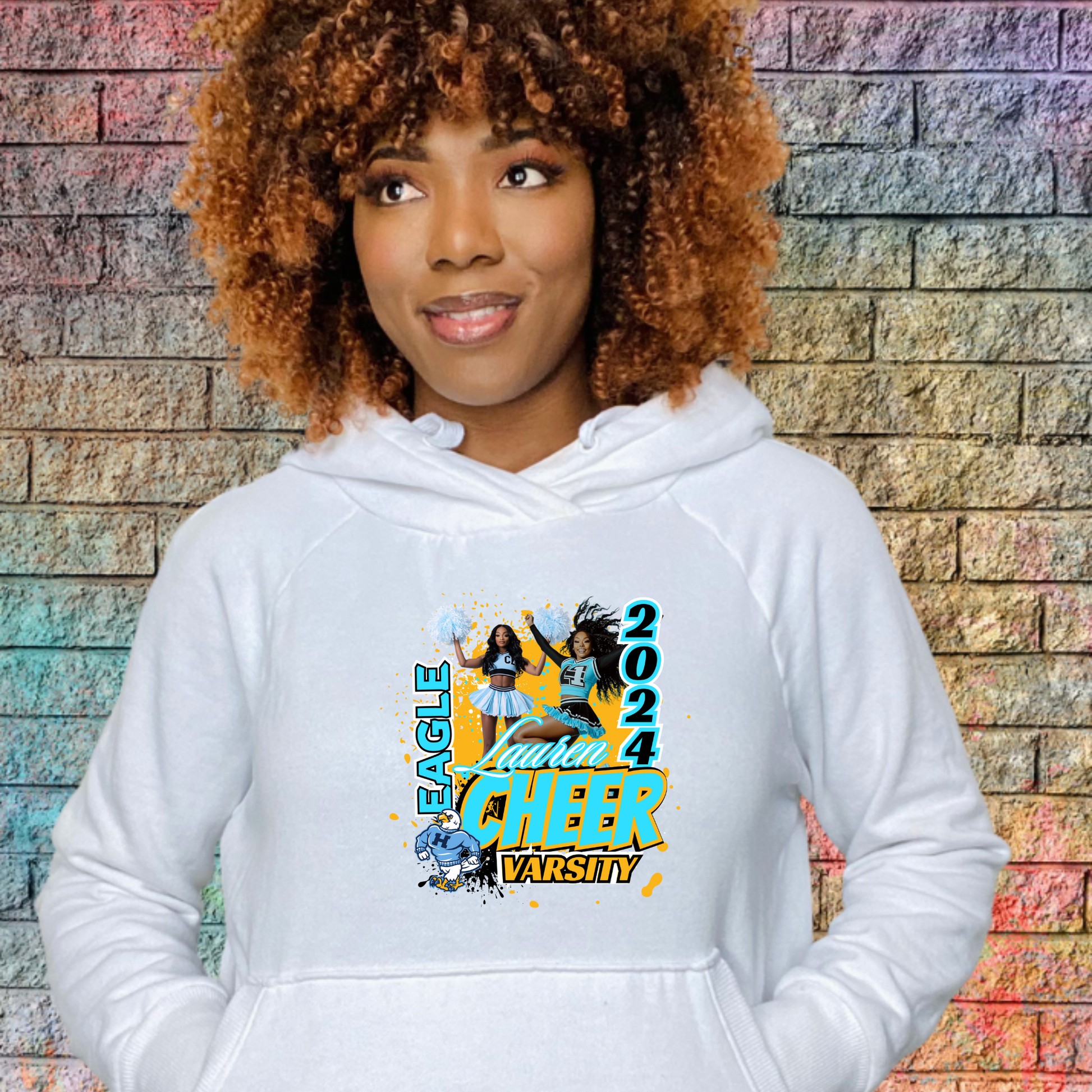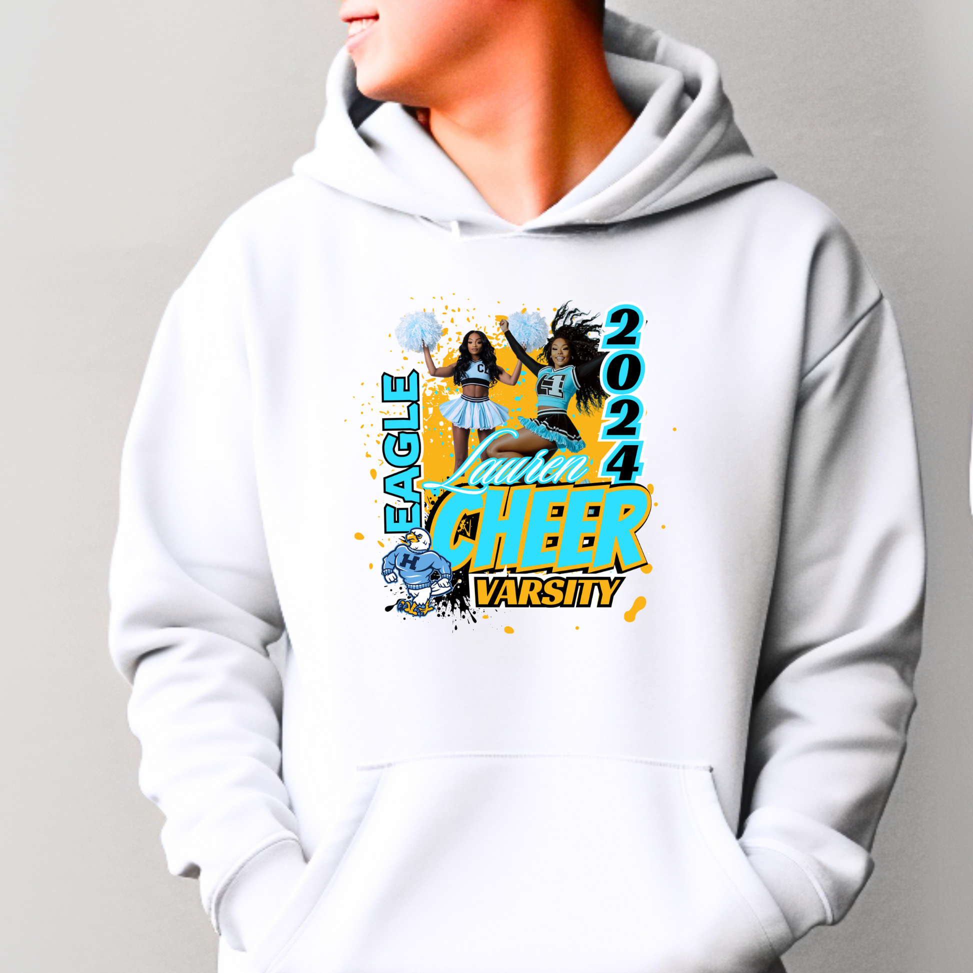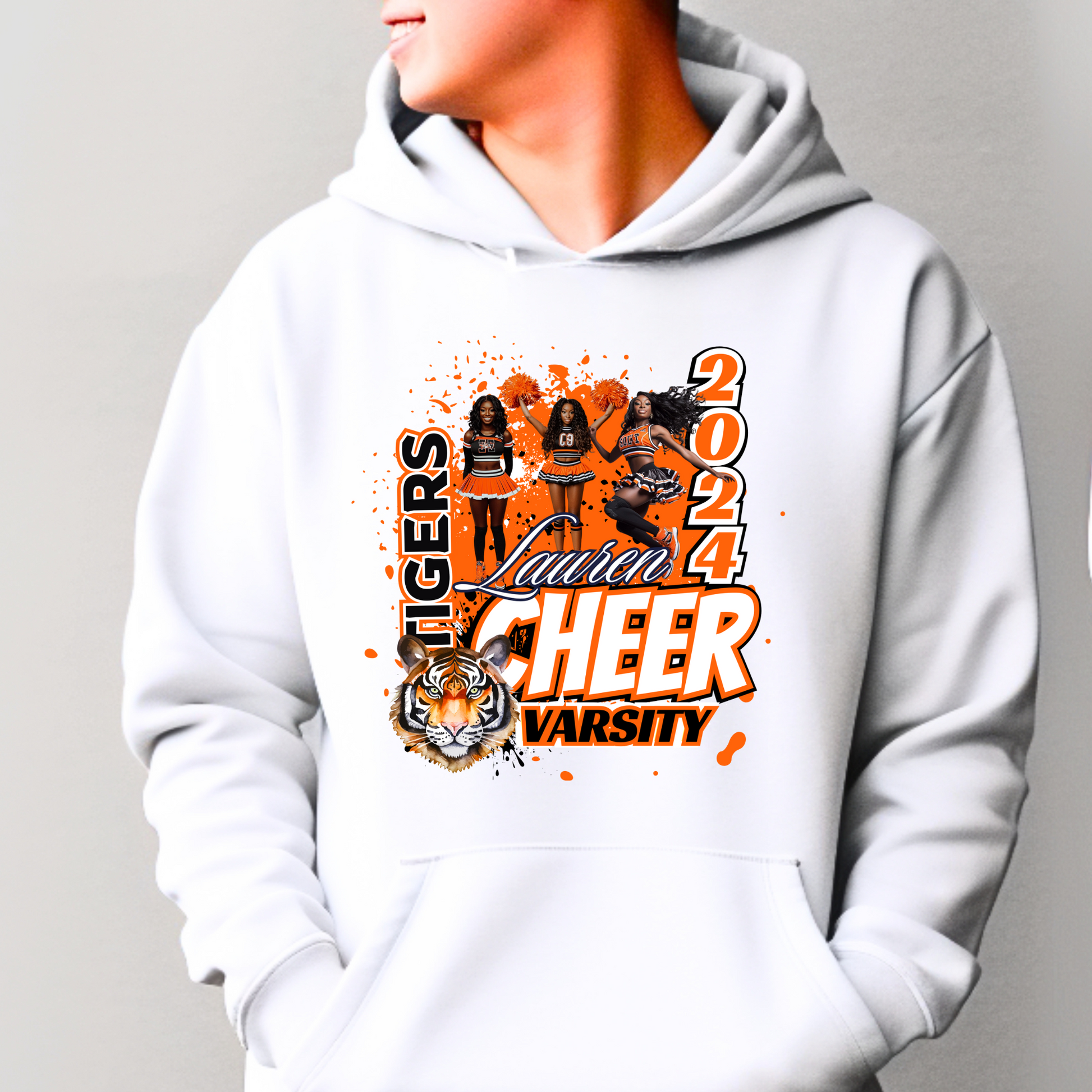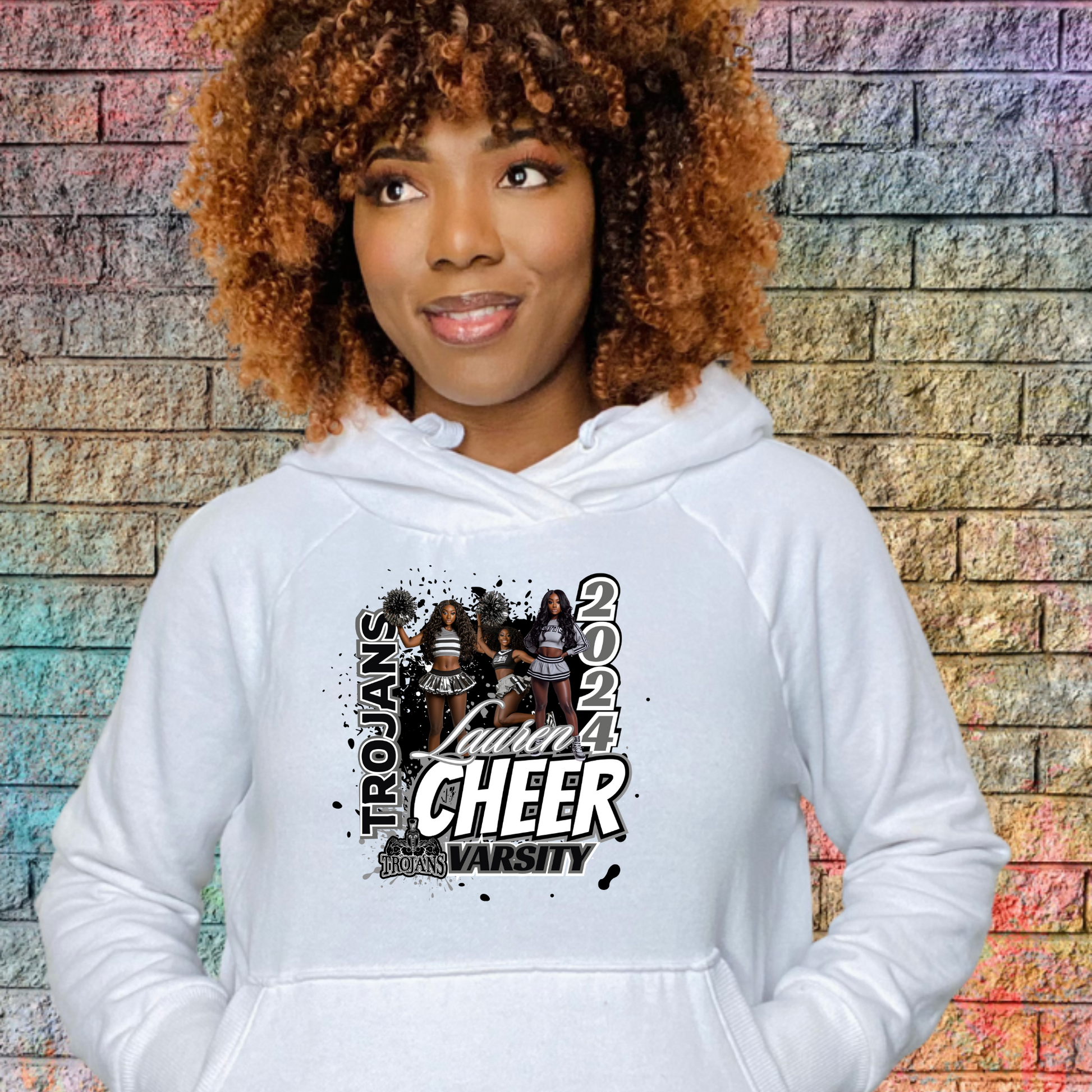 Experience the ultimate game day gear with our custom personalized cheerleader Hoodie! Featuring your own photo, name, school name, color, and number, this shirt is sure to make a statement on and off the field. Show your team pride and stand out from the crowd with this one-of-a-kind shirt.