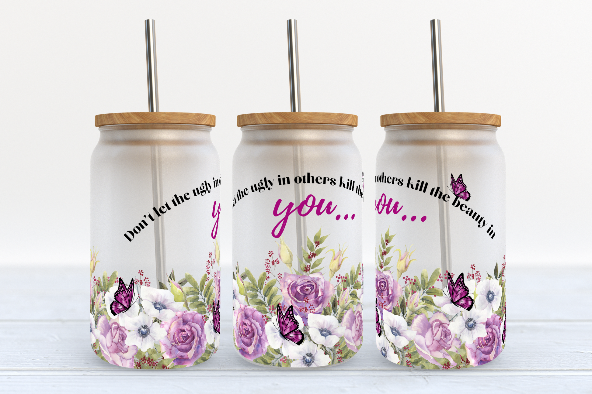 ntroducing the "Beauty in You" Glass Can, adorned with stunning purple roses and butterflies. This 16oz glass tumbler is more than just a drinkware item – it's a celebration of beauty and nature, offering a refreshing way to enjoy your cold beverages.