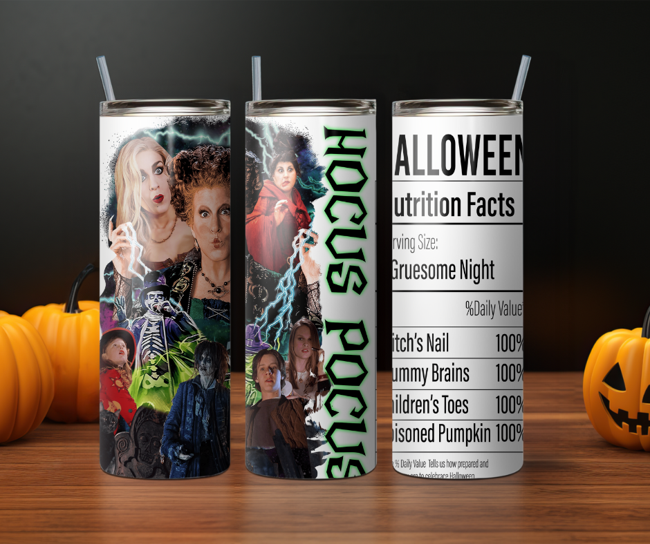 Introducing the "Hocus Pocus Nutrition Facts Tumbler" - a bewitching elixir vessel that blends enchanting design with practicality, casting a spell of delight over every sip! 🧙♀️🔮