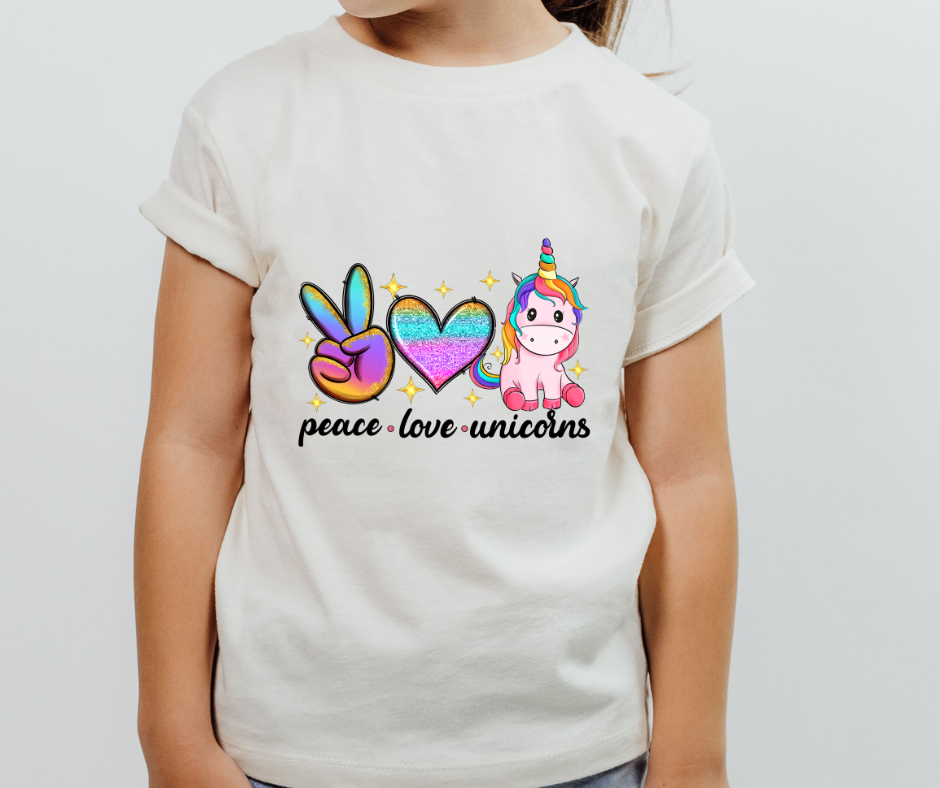 Peace Love Unicorns Toddler Shirt The "Peace Love Unicorns Toddler Shirt" is a whimsical and enchanting piece of clothing specially crafted to bring a touch of magic to your toddler's wardrobe. Made from 100% organic cotton, this shirt not only ensures your child's comfort but also aligns with environmentally conscious choices. Here's a closer look at this delightful product with a touch of magical charm: