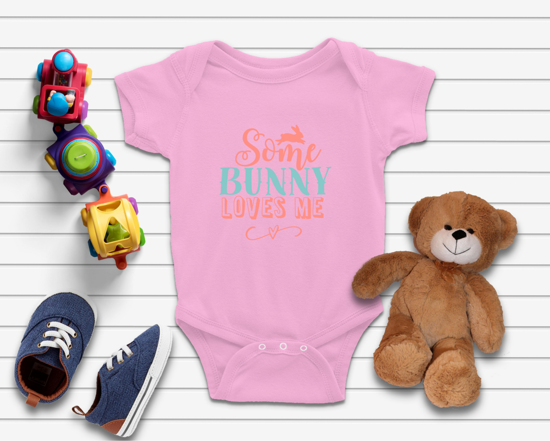 Crafted with pure cotton, this onesie promises a gentle embrace for your little one, ensuring softness against delicate skin. The DTF design technique brings to life the heartwarming phrase "Some Bunny Loves Me," creating an irresistibly cute visual experience that captures the essence of Easter joy.